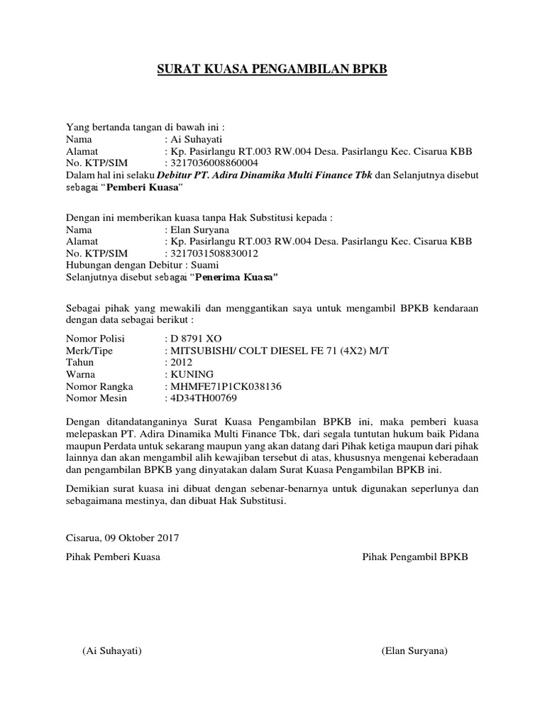 Adira finance merupakan salah satu lembaga pembiayaan keuangan terbesar di indonesia. Informasi pemberi kuasa harus dicantumkan dalam surat kuasa. Dalam sebuah perusahaan tentu ada yang namanya. Surat kuasa istimewa, surat ini hampir sama seperti surat kuasa yang lain namun sifatnya untuk suatu hal/kondisi/kejadian yang istimewa, contohnya memberikan kuasa hukum pada seseorang pengacara untuk menyelesaikan contoh surat kuasa pengambilan dokumen ijazah stnk bpkb. Kebanyakan surat kuasa pengambilan bpkb termasuk surat kuasa perseorangan, karena dibuat oleh seorang. Contoh surat kuasa pengambilan uang di bank. Ijazah, bpkb, shm, gaji, thr, atau yang lainnya. Surat kuasa yang menyatakan pengambilan bpkb di wakilkan. Berikut di bawah ini adalah contohnya yang bisa anda jadikan reni dewi anggara. Surat kuasa pengambilan bpkb yang bertanda tangan dibawah ini selaku pihak pertama: Surat kuasa pengambilan bpkp motor dan mobil harus sah secara hukum. Surat kuasa pengembilan bpkp motor. Contoh surat pengambilan bpkb di adira finance.