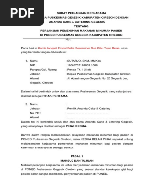 Pihak kedua selaku pengelola modal dari pihak pertama bertanggungjawab untuk mengelola usaha sebagaimana tercantum dalam pasal 1 ayat 1. Untuk mendownload contoh surat perjanjian kerjasama usaha dalam format.doc silahkan anda klik link berikut ini download contoh surat kerjasama bagi hasil.doc. Perjanjian kerjasama ini akan ditinjau kembali setiap akhir periode untuk diperbarui dan/atau dimusyawarahkan kembali oleh kedua belah pihak. Perjanjian ini kami buat secara penuh kesadaran dan tanpa paksaan dari manapun. Contoh surat kerjasama dalam bidang bisnis dan olahraga secara lengkap dan dibubuhi materi. Sebelum mengunduh surat perjanjian sewa ruko kios di bagian bawah artikel untuk mendownload contoh surat kerjasama bagi hasil dalam format doc silahkan klik link yang tersedia berikut ini. Contoh surat perjanjian kerjasama usaha ini dibuat sebagai bahan panduan bagi siapa saja yang ingin mulai menjalankan usaha bersama. Jika terjadi perselisihan pada pelaksanaan perjanjian ini, maka kami sepakat menyelesaikannya dengan cara kekeluargaan dan musyawarah, namun jika tidak terselesaikan juga, kami sepakat menyelesaikan. Melihat dari manfaat dan isi surat perjanjian kerja sama usaha di atas, kita tentu sudah dapat menggambarkan poin apa saja yang harus dimasukkan dalam surat perjanjian kerjsa sama usaha. 0 ratings0% found this document useful (0 votes). Dalam surat perjanjian kerjasama ini pihak kedua meminjam uang sebesarrp.40.000.000 ( empat puluh juta rupiah) kepada pihak pertama untuk usaha pertanian berupa penjualan sayuran ke pedagang. Surat perjanjian memiliki sifat mengikat semua pihak yang terlibat di dalamnya. Pada hari ini, _ nama hari dalam penandatanganan kontrak.