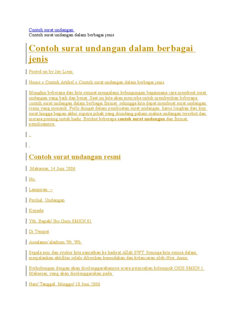 Tak hanya soal jumlah maupun isi undangannya, masalah desain pun jadi hal penting yang harus dipertimbangkan secara matang. Undangan bandung, jalan jatihandap timur rt 03/07 kel. Dari kedua jenis surat ini mempunyai tujuan tersendiri dan tidak dapat digunakan di sembarang tempat. Berikut adalah tampilan contoh undangan pengajian walimatul khitan format document word yang bisa diedit. Download as docx, pdf, txt or read online from scribd.